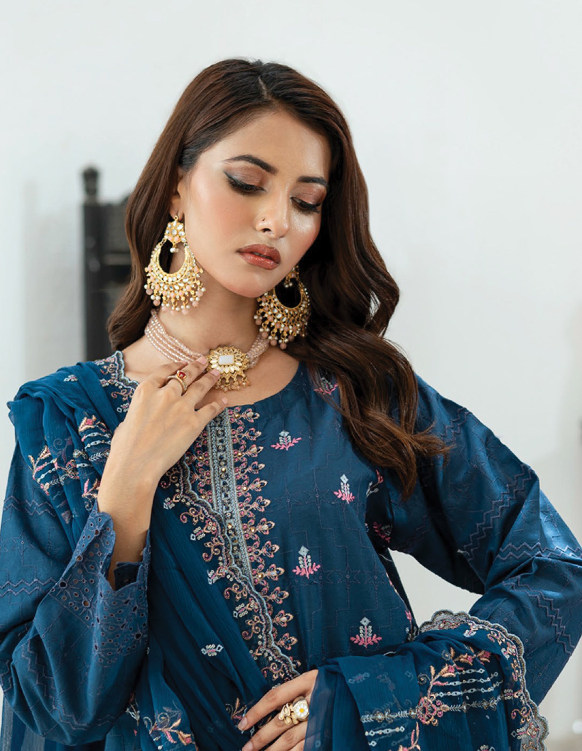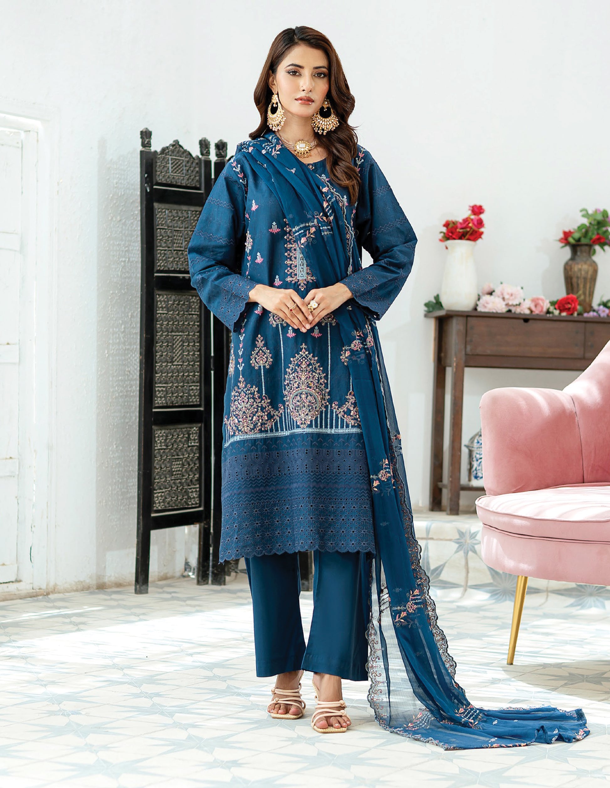 •) UNSTITCHED Digital Print 2 Head Embroidered Lawn Shirt •) Digital Print Lawn Dupatta•) Fine Dyed Cotton Cambric Trouser.