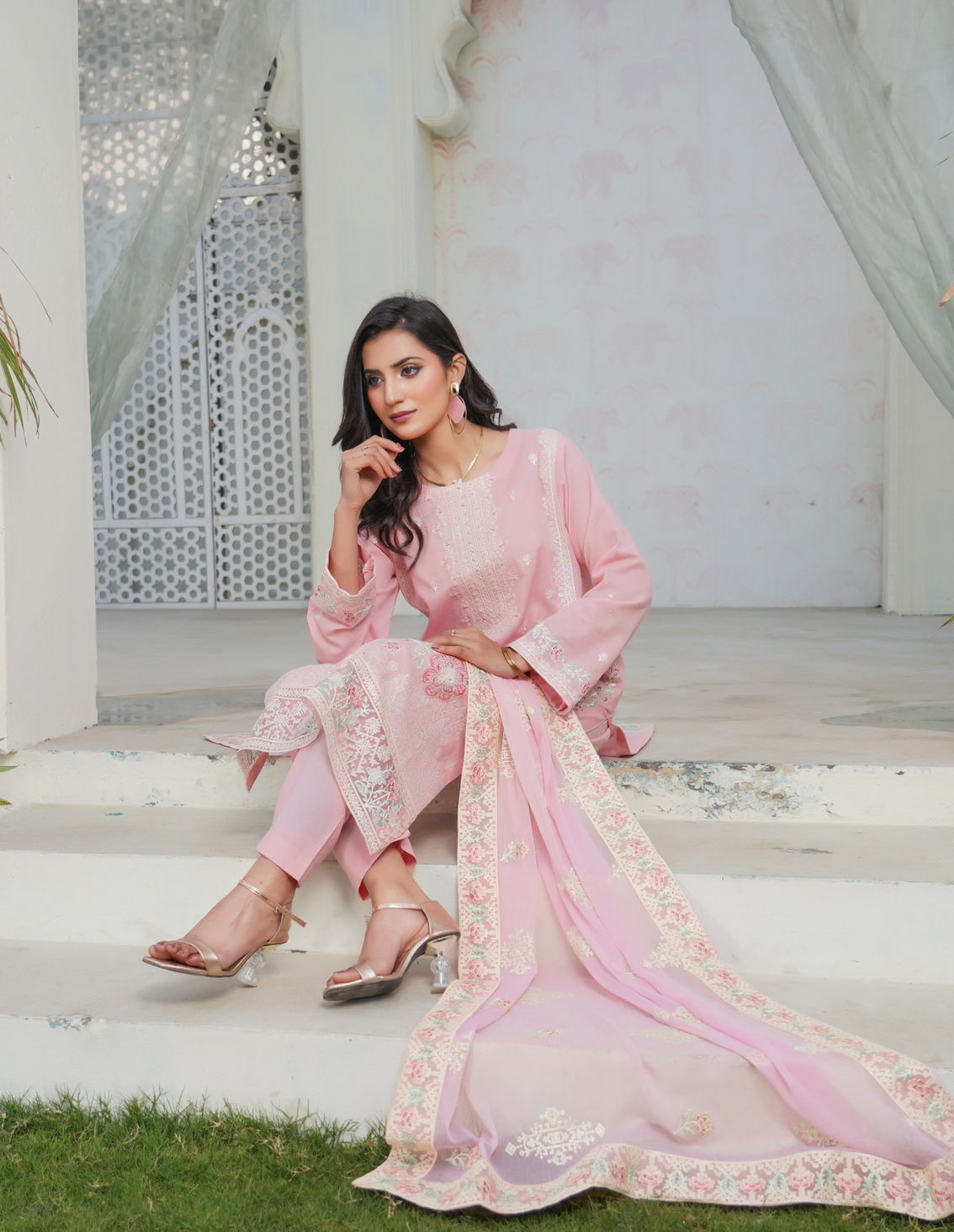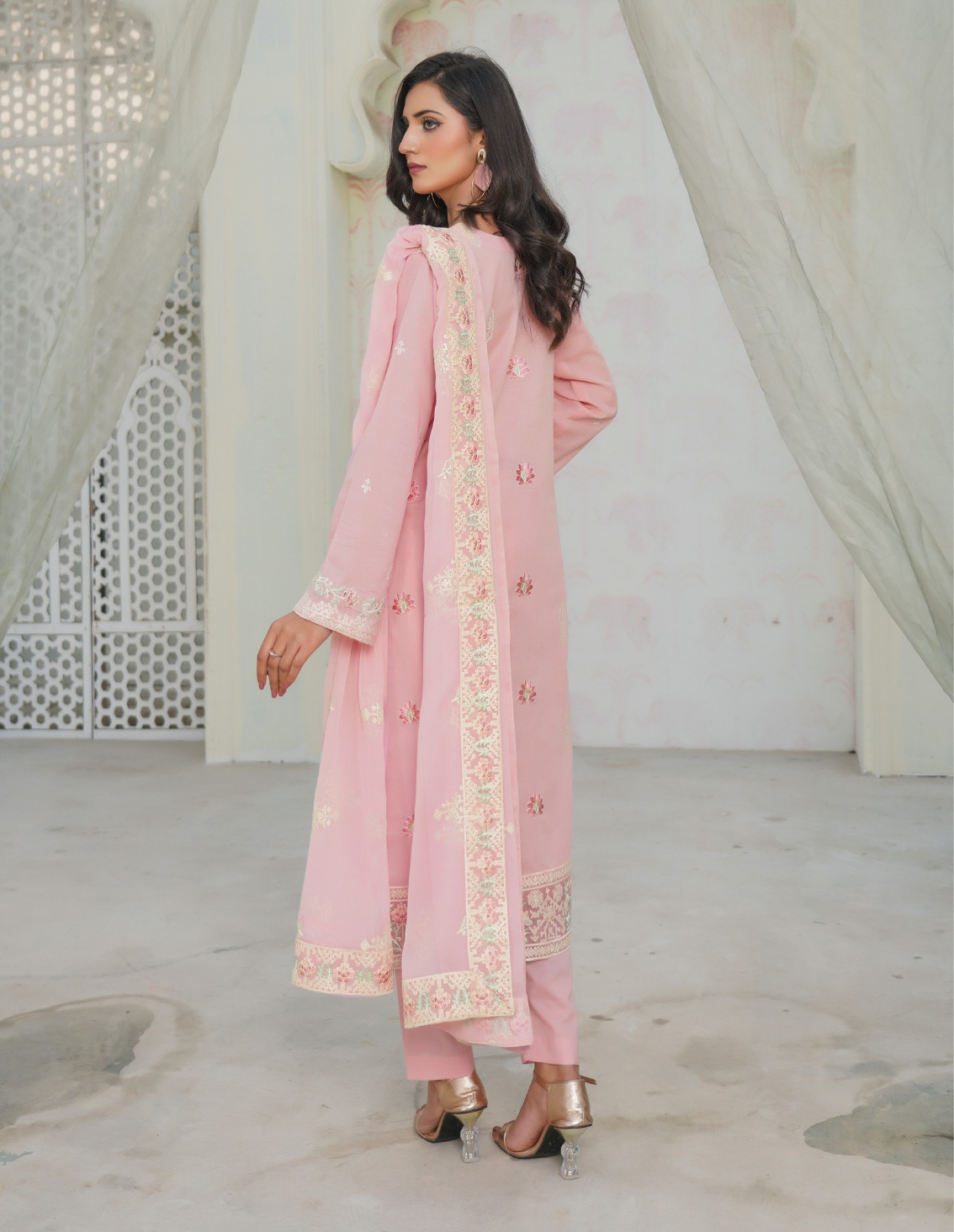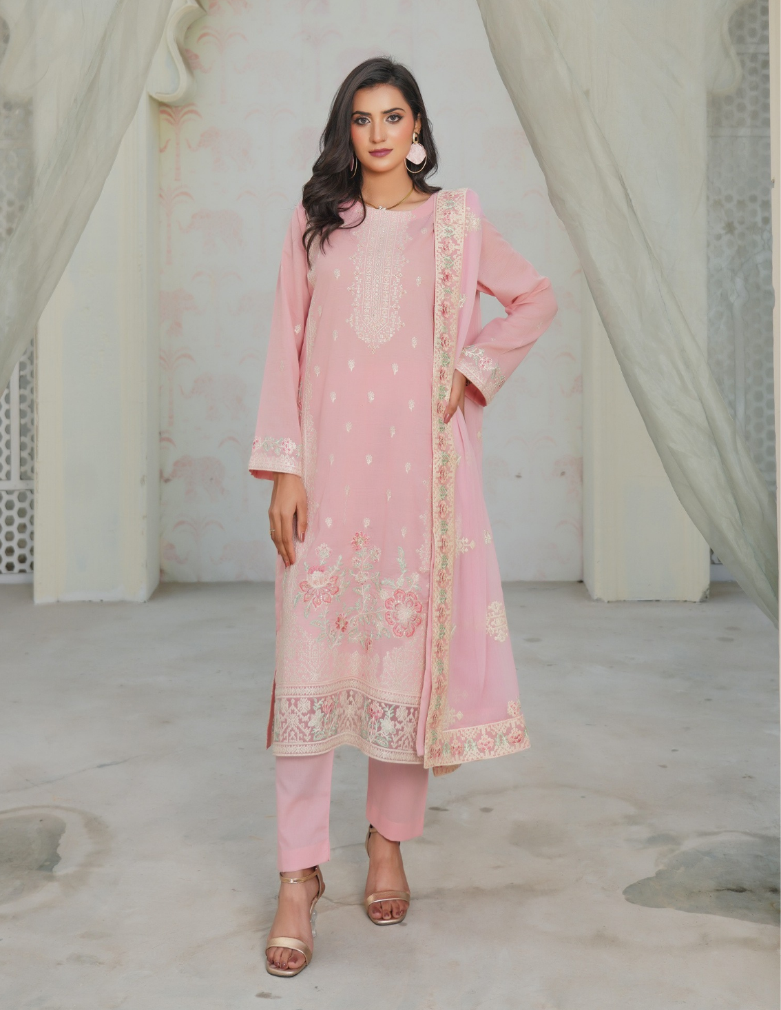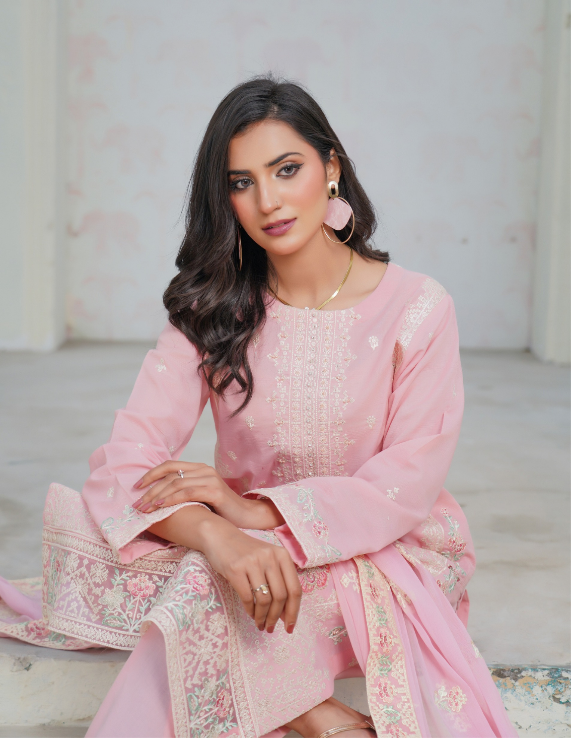 Shirt: Embroidered Bana Dora with Fancy Hand EmbellishmentsDupatta: Fancy Embroidered ChiffonTrouser: Fine Dyed Cotton Cambric