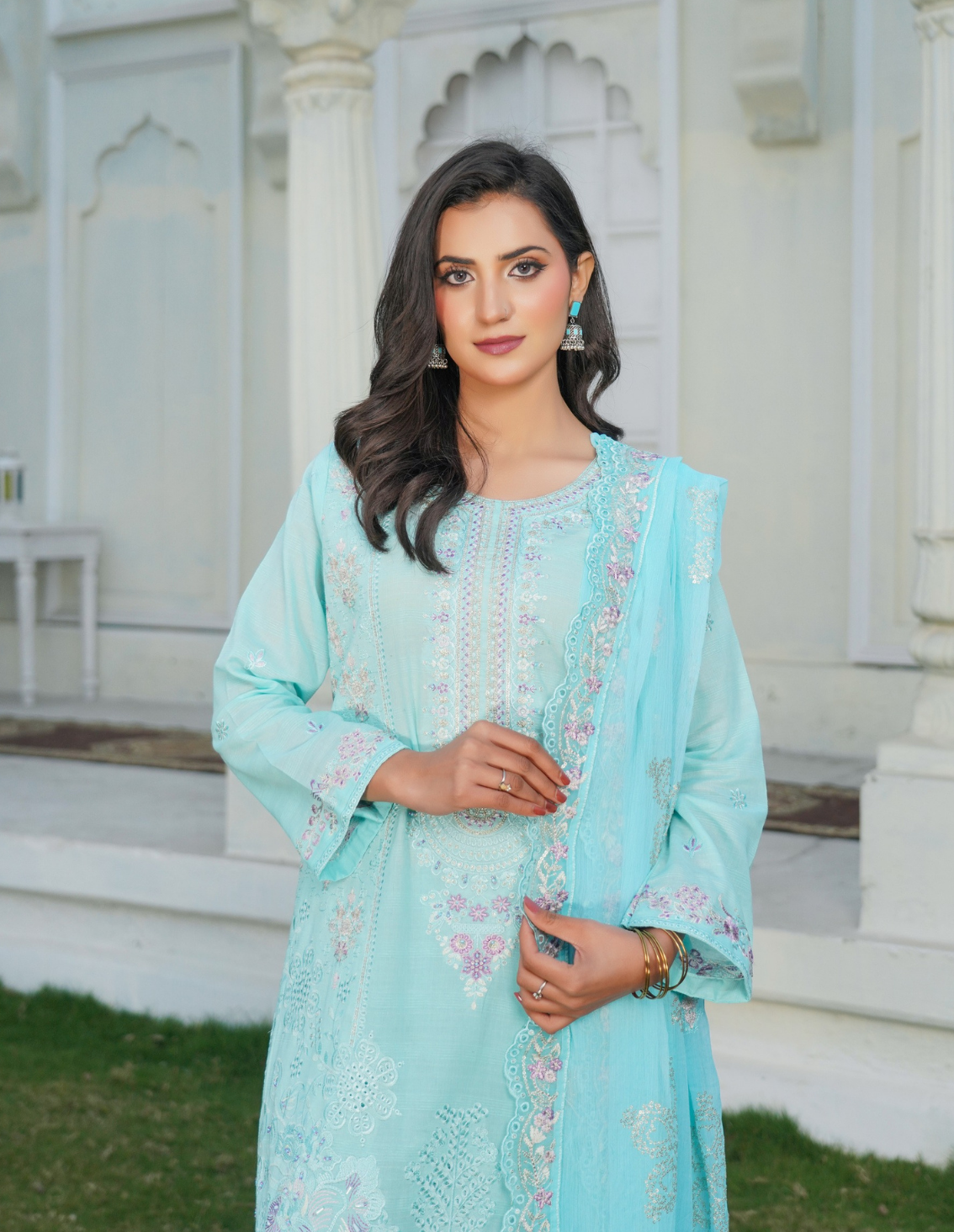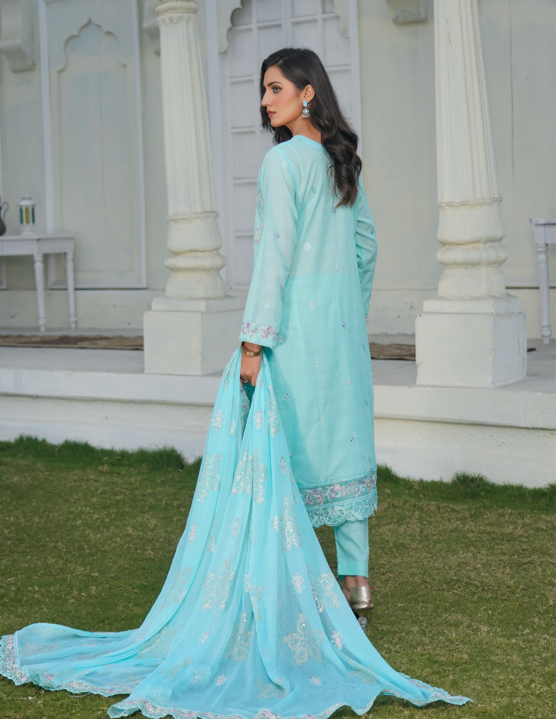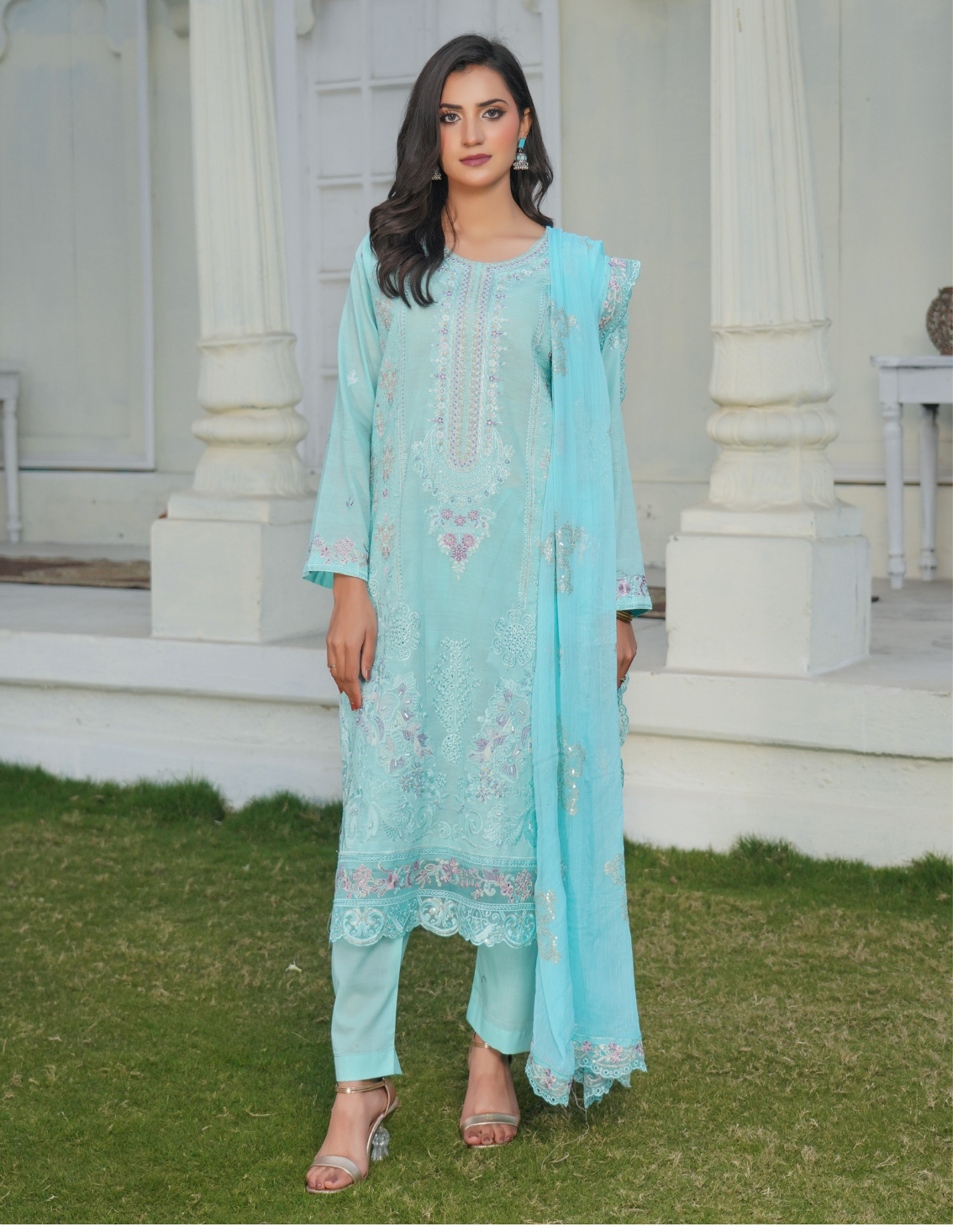 Shirt: Embroidered Bana Dora with Fancy Hand EmbellishmentsDupatta: Fancy Embroidered ChiffonTrouser: Fine Dyed Cotton Cambric