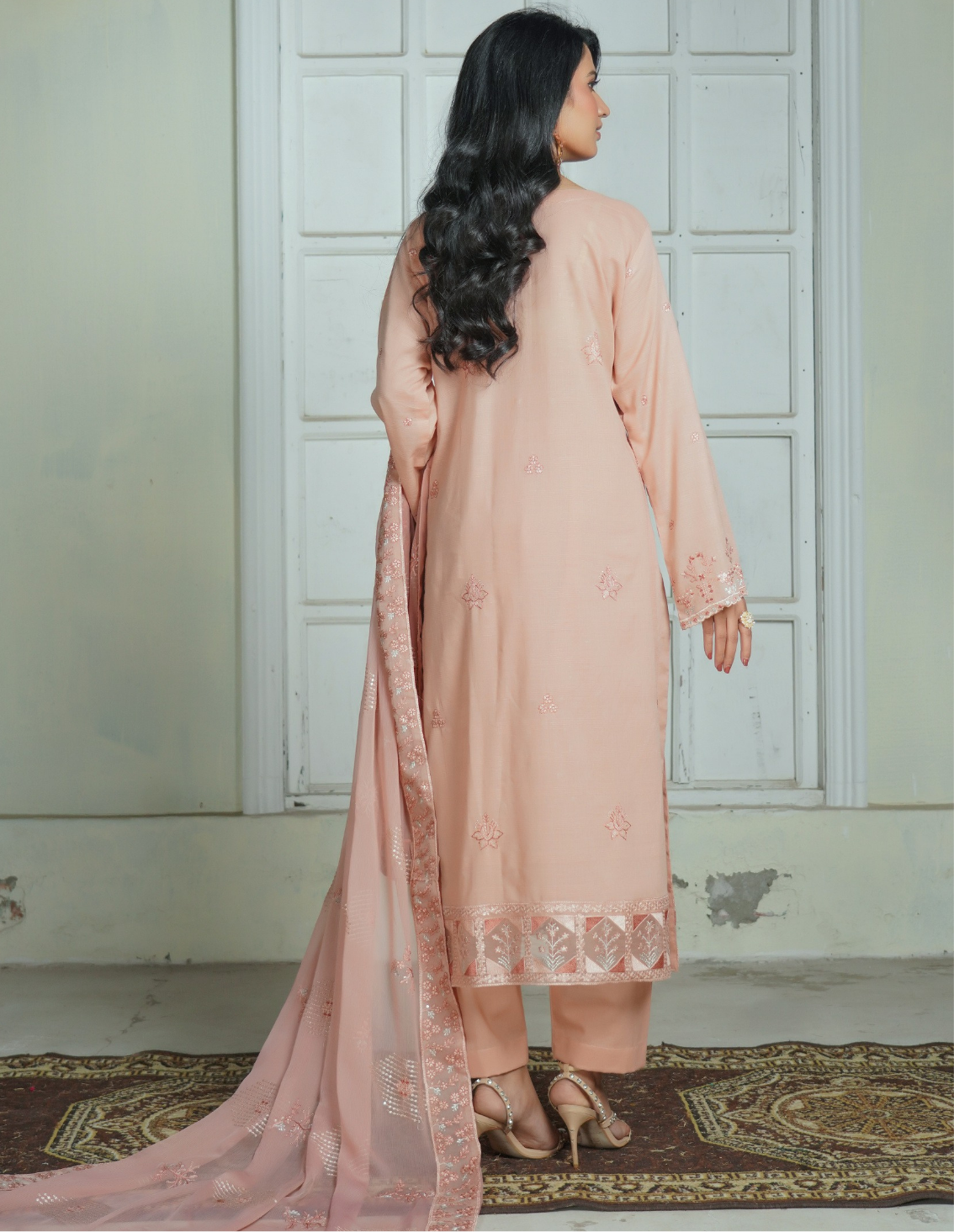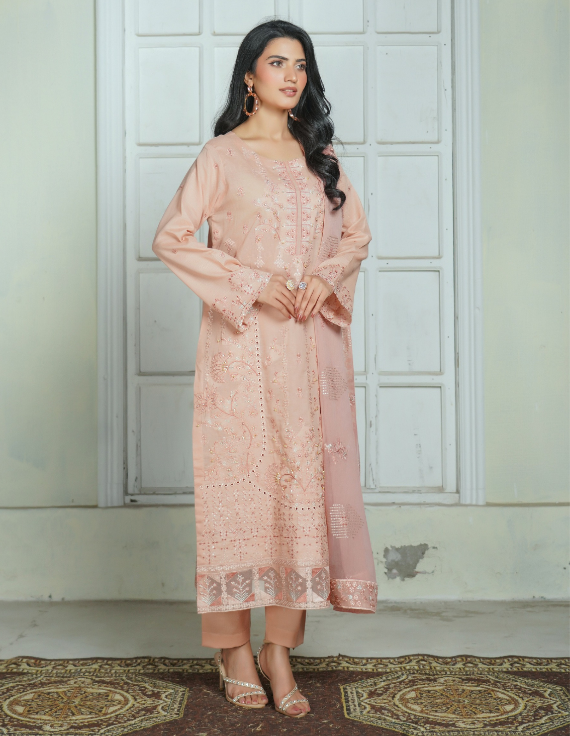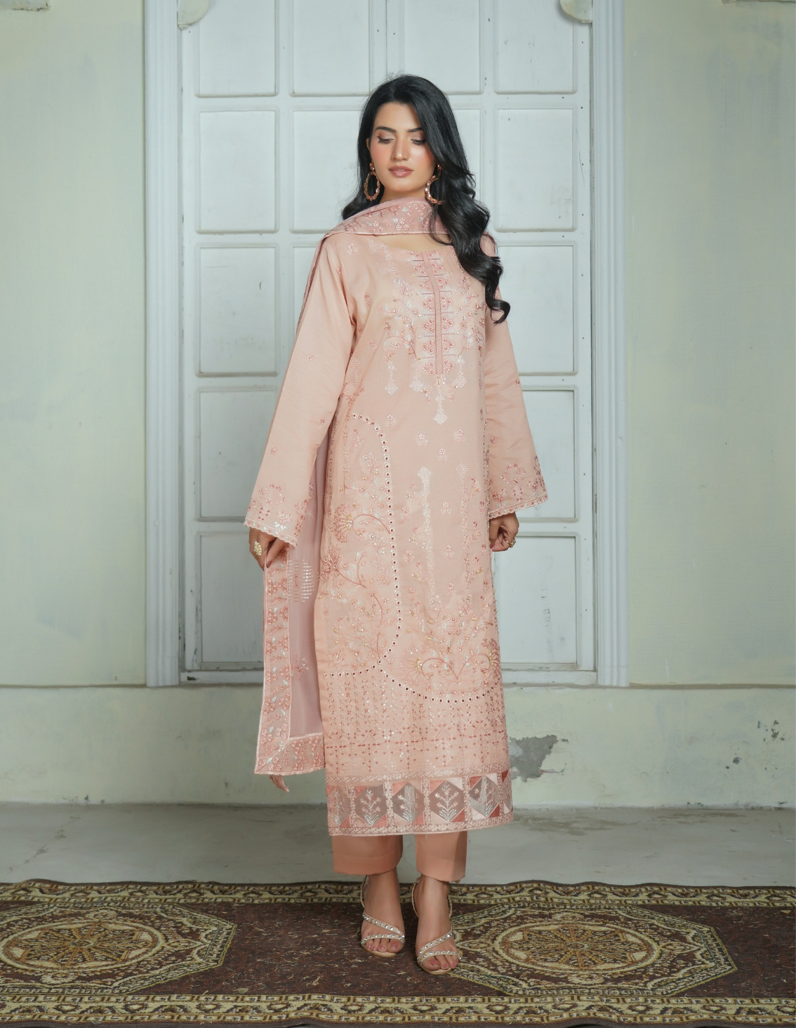 Shirt: Embroidered Bana Dora with Fancy Hand EmbellishmentsDupatta: Fancy Embroidered ChiffonTrouser: Fine Dyed Cotton Cambric